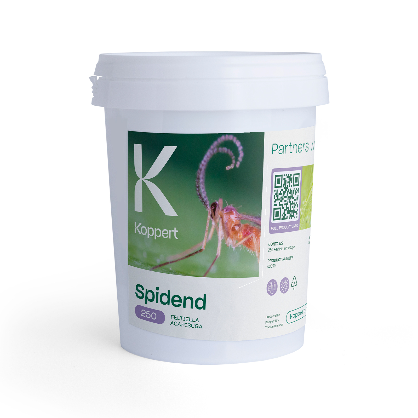 Doseringen av Spidend beror på klimatet, grödan och densiteten spinnkvalster och ska alltid anpassas efter den särskilda situationen. Påbörja insättningen så snart de första spinnkvalstren upptäcks bland grödan. Insättningsmängd är normalt 0,25-25 per m2/spridning. Spridning ska upprepas minst 3 gånger i veckointervall eller tills skadegöraren är bekämpad. Be en Koppert-rådgivare eller en erkänd distributör av Koppert-produkter om råd om den bästa strategin för din situation.