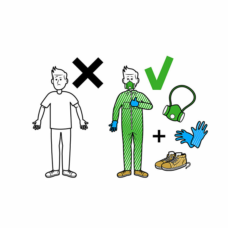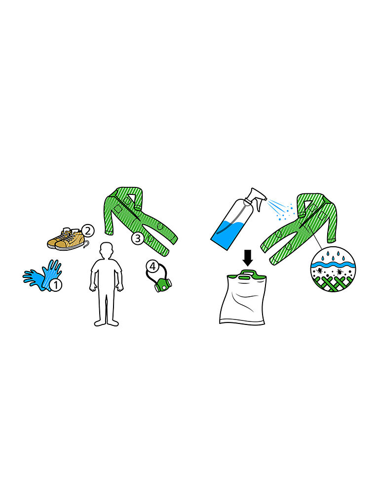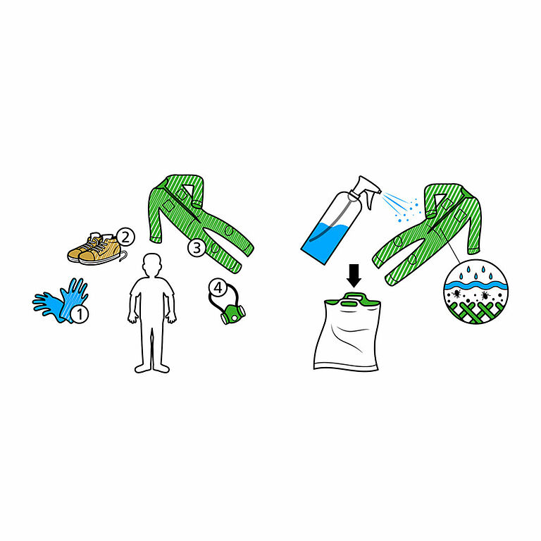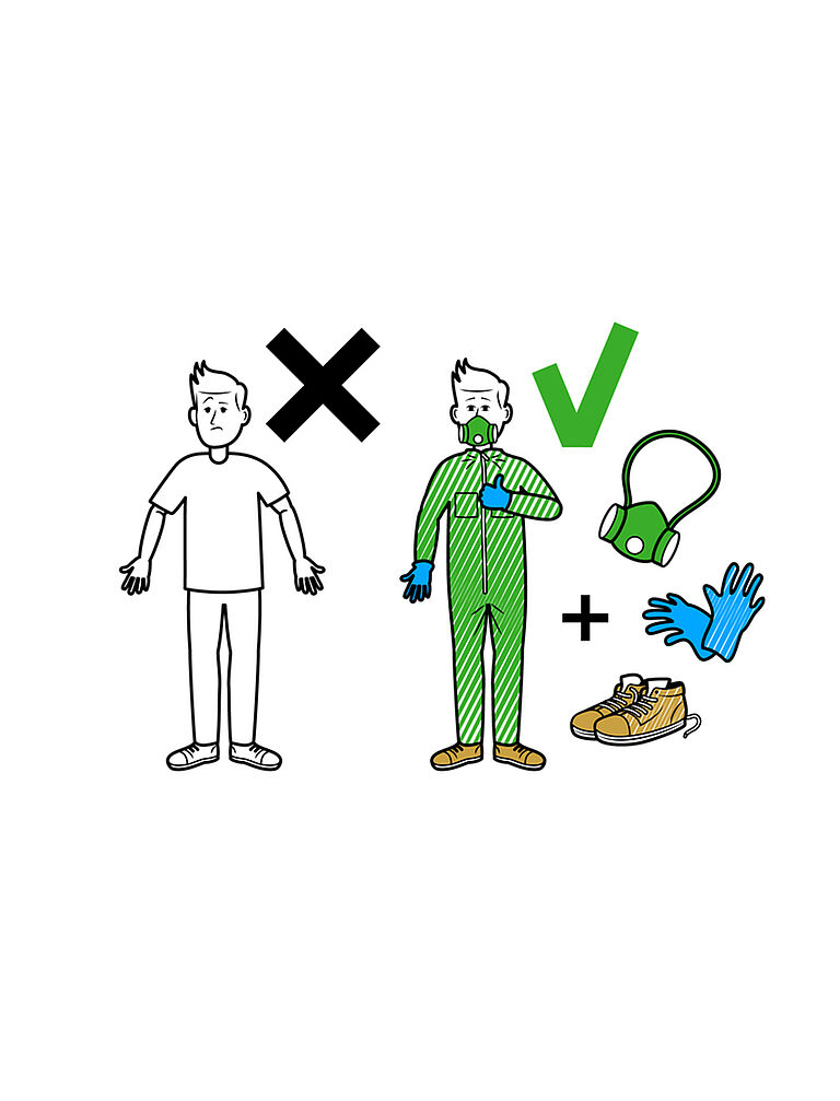 Jos on olemassa ihoaltistuksen riski, suosittelemme käyttämään suoja-asua, joka peittää käsivarret ja jalat (esim. kertakäyttöhaalari). Myös kädet tulee suojata hansikkailla.